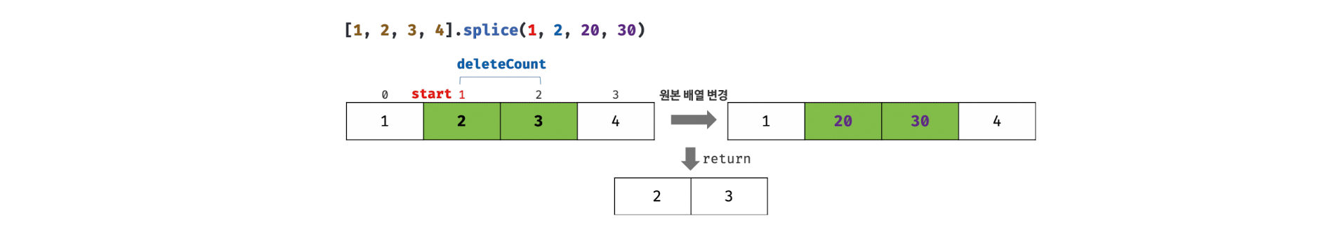 const arr = [1, 2, 3, 4]; // 원본 배열의 인덱스 1부터 2개의 요소를 제거한다. const result = arr.splice(1, 2); // 원본 배열이 변경된다. console.log(arr); // [1, 4] // 제거한 요소가 배열로 반환된다. console.log(result); // [2, 3]