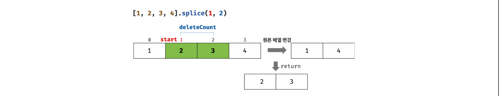 const arr = [1, 2, 3, 4]; // 원본 배열의 인덱스 1부터 2개의 요소를 제거한다. const result = arr.splice(1, 2); // 원본 배열이 변경된다. console.log(arr); // [1, 4] // 제거한 요소가 배열로 반환된다. console.log(result); // [2, 3]