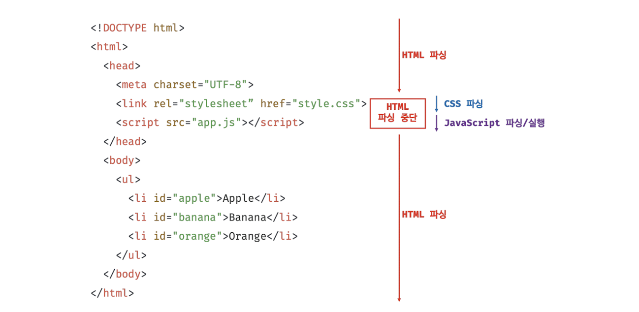 <!DOCTYPE html> <html> <head> <meta charset="UTF-8"> <link rel="stylesheet" href="style.css"> <script> const $apple = document.getElementById('apple'); $apple.style.color = 'red'; // TypeError: Cannot read property 'style' of null </script> </head> <body> <ul> <li id="apple">Apple</li> <li id="banana">Banana</li> <li id="orange">Orange</li> </ul> </body> </html>위 예제 코드에서 id가 apple인 HTML 요소는 아직 파싱되지 않았고, 따라서 DOM 내에 존재하지 않는다. 따라서 위 예제의 script 내부의 코드는 정상 작동하지 않는다.