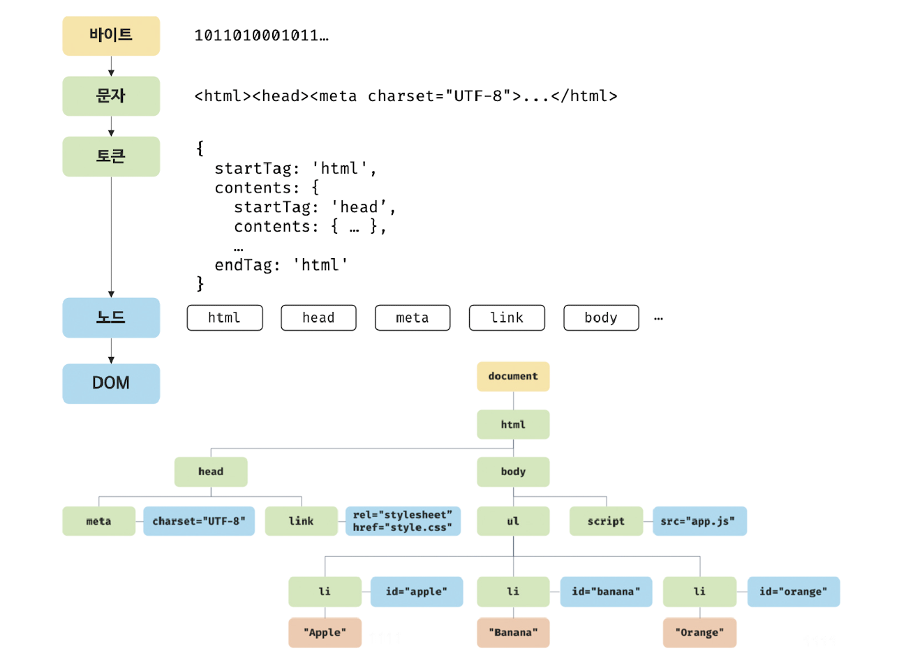 - 브라우저는 서버가 응답한 HTML 문서를 바이트(2진수) 형태로 응답 받는다.