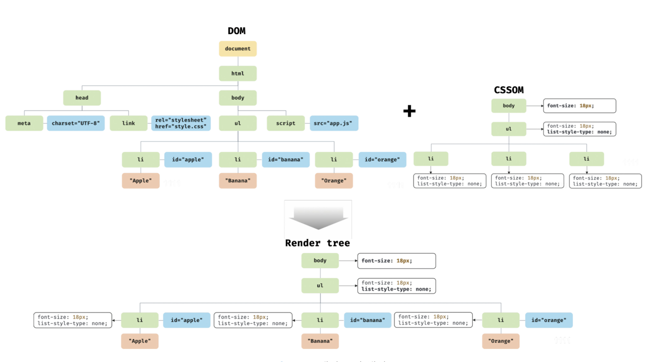 렌더링 엔진은 서버로부터 응답된 HTML,CSS을 파싱하여 각각 DOM,CSSOM을 생성한다. 이 DOM과 CSSOM은 렌더링을 위해 렌더 트리로 결합된다.