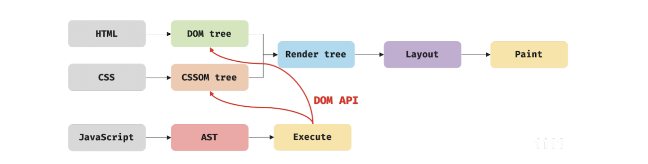 자바스크립트 코드에 의해 DOM이나 CSSOM을 변경하는 DOM API가 사용된 경우 DOM이나 CSSOM이 변경된다. 이때 변경된 DOM이나 CSSOM은 다시 렌더 트리로 결합되고, 변경된 렌더 트리를 기반으로 레이아웃과 페인트 과정을 거쳐 브라우저의 화면에 다시 렌더링한다.