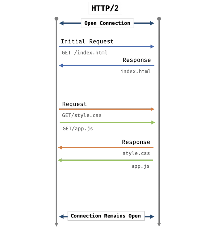 HTTP/2는 커넥션당 여러 개의 요청과 응답, 즉 다중 요청/응답이 가능하다. 따라서 HTTP/2.0은 여러 리소스의 동시 전송이 가능하므로 HTTP/1.1보다 페이지 로드 속도가 더 빠르다고 알려져 있다.