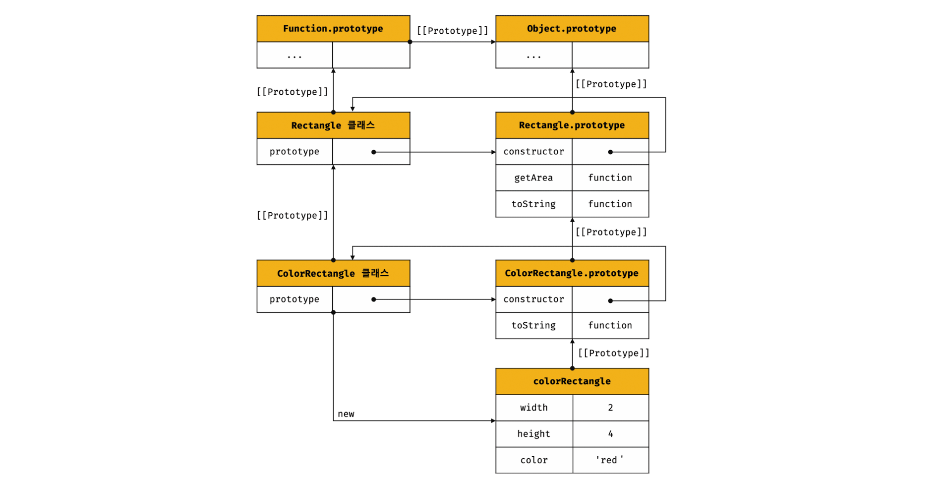 // 수퍼클래스 class Rectangle { constructor(width, height) { this.width = width; this.height = height; } getArea() { return this.width * this.height; } toString() { return `width = ${this.width}, height = ${this.height}`; } } // 서브클래스 class ColorRectangle extends Rectangle { constructor(width, height, color) { super(width, height); this.color = color; } // 메서드 오버라이딩 toString() { return super.toString() + `, color = ${this.color}`; } } const colorRectangle = new ColorRectangle(2, 4, 'red'); console.log(colorRectangle); // ColorRectangle {width: 2, height: 4, color: "red"} // 상속을 통해 getArea 메서드를 호출 console.log(colorRectangle.getArea()); // 8 // 오버라이딩된 toString 메서드를 호출 console.log(colorRectangle.toString()); // width = 2, height = 4, color = red위 예제 코드의 인스턴스 생성과정을 자세히 살펴보자. 위 예제의 프로토타입 체인은 다음과 같다.