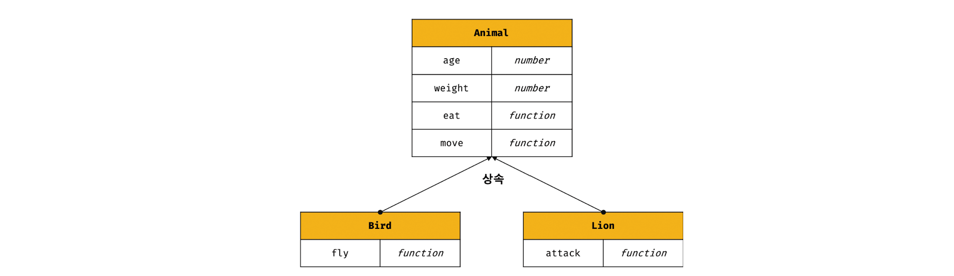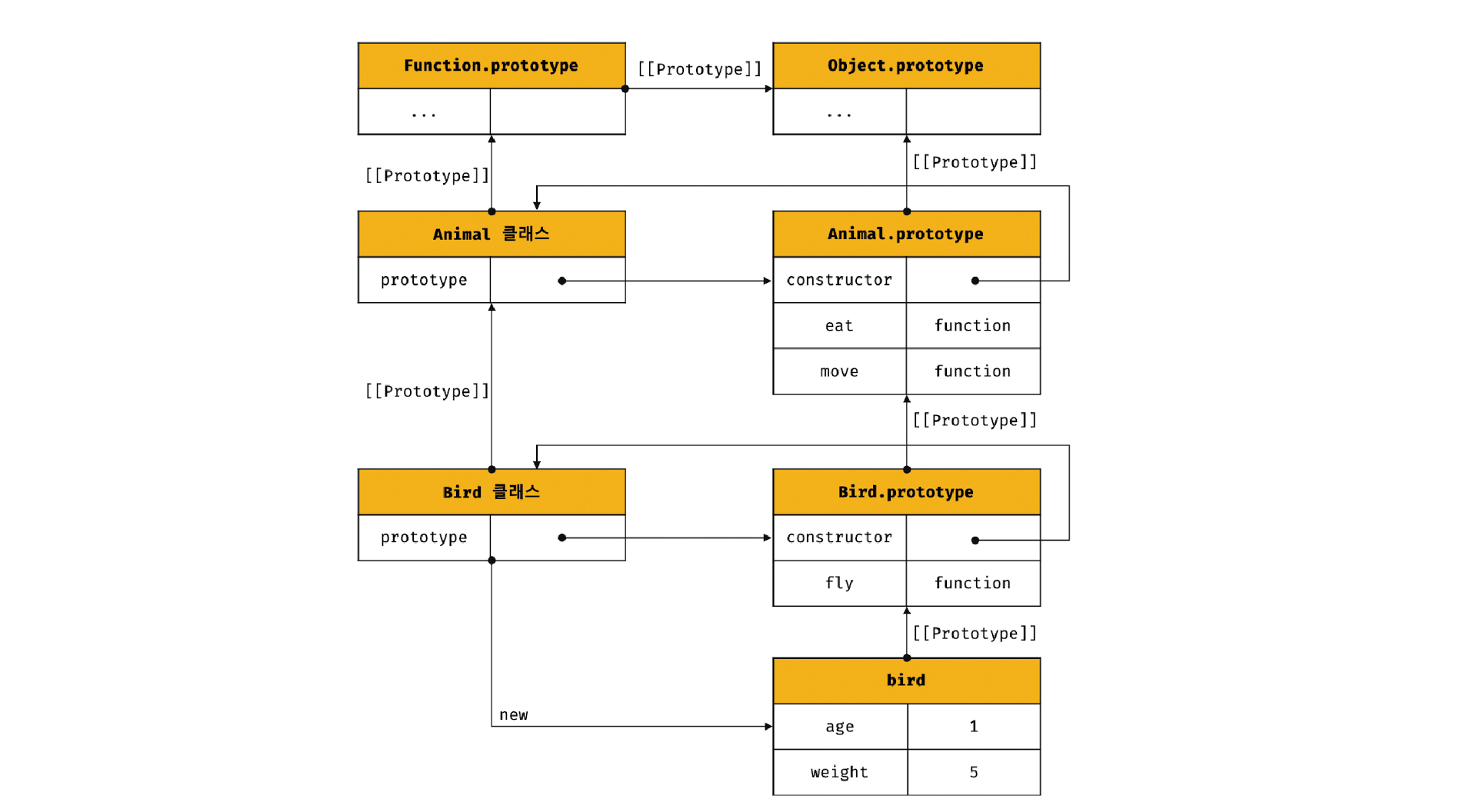 class Animal { constructor(age, weight) { this.age = age; this.weight = weight; } eat() { return 'eat'; } move() { return 'move'; } } // 상속을 통해 Animal 클래스를 확장한 Bird 클래스 class Bird extends Animal { fly() { return 'fly'; } } const bird = new Bird(1, 5); console.log(bird); // Bird {age: 1, weight: 5} console.log(bird instanceof Bird); // true console.log(bird instanceof Animal); // true console.log(bird.eat()); // eat console.log(bird.move()); // move console.log(bird.fly()); // fly