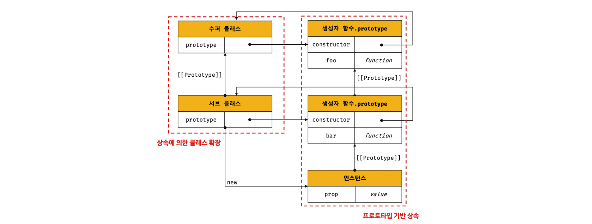 자바스크립트 엔진은 클래스를 평가할 때 수퍼클래스와 서브클래스를 구분하기 위해 "base" 또는 "derived"를 값으로 갖는 내부 슬롯 [[ConstructorKind]]를 갖는다. 생성자 함수와 다른 클래스를 상속받지 않는 클래스는 "base", 다른 클래스를 상속받는 클래스는 "derived" 값이 설정된다. 이를 통해 수퍼클래수와 서브클래스를 구분한다.