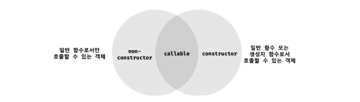 function foo() {} // 일반적인 함수로서 호출: [[Call]]이 호출된다. foo(); // 생성자 함수로서 호출: [[Construct]]가 호출된다. new foo();내부 메서드 [[Call]]을 갖는 함수 객체를 callable이라 하며, 내부 메서드 [[Construct]]를 갖는 함수 객체를 constructor, [[Constructor]]를 갖지 않는 함수 객체를 non-constuctor라고 부른다. callable은 호출할 수 있는 객체, 즉 함수를 말하며, constructor는 생성자 함수로서 호출할 수 있는 함수, non-constructor는 객체를 생성자 함수로서 호출할 수 없는 함수를 의미한다. 호출할 수 없는 객체는 함수 객체가 아니므로 함수로서 가능하는 객체, 즉 함수 객체는 반드시 callable이어야 한다.