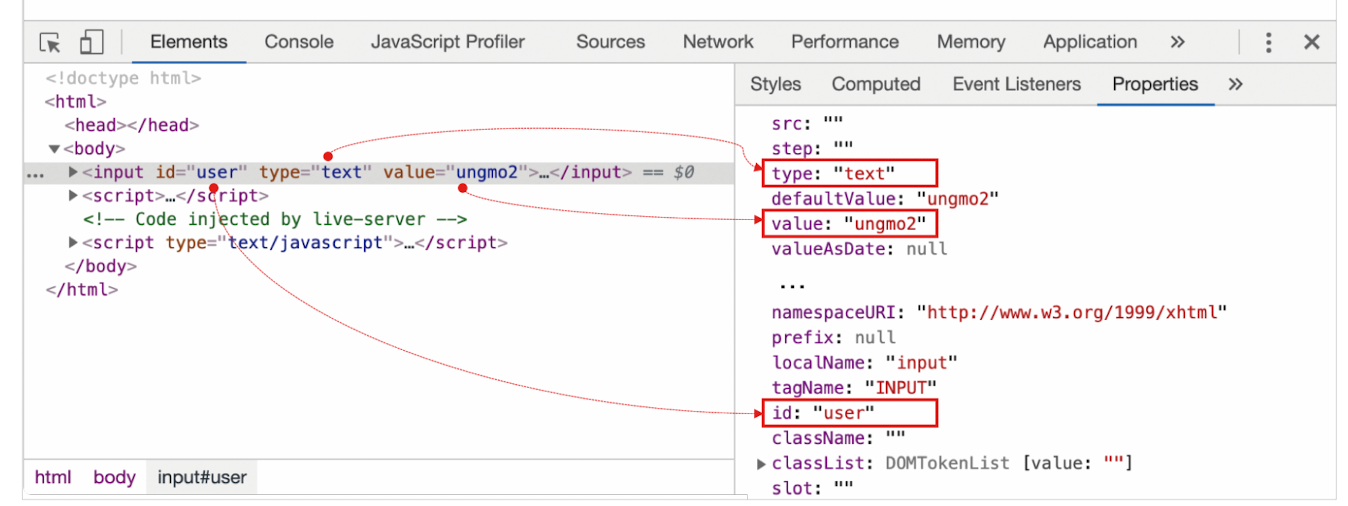 <!DOCTYPE html> <html> <body> <input id="user" type="text" value="ungmo2"> <script> const $input = document.getElementById('user'); // DOM 프로퍼티에 값을 할당하여 HTML 요소의 최신 상태를 변경한다. $input.value = 'foo'; console.log($input.value); // foo // getAttribute 메서드로 취득한 HTML 어트리뷰트 값, 즉 초기 상태 값은 변하지 않고 유지된다. console.log($input.getAttribute('value')); // ungmo2 </script> </body> </html>다만, 사용자 입력에 의한 상태 변화와 관계없는 id와 같은 어트리뷰트는 프로퍼티와 항상 동일한 값을 유지한다(반대도 마찬가지).