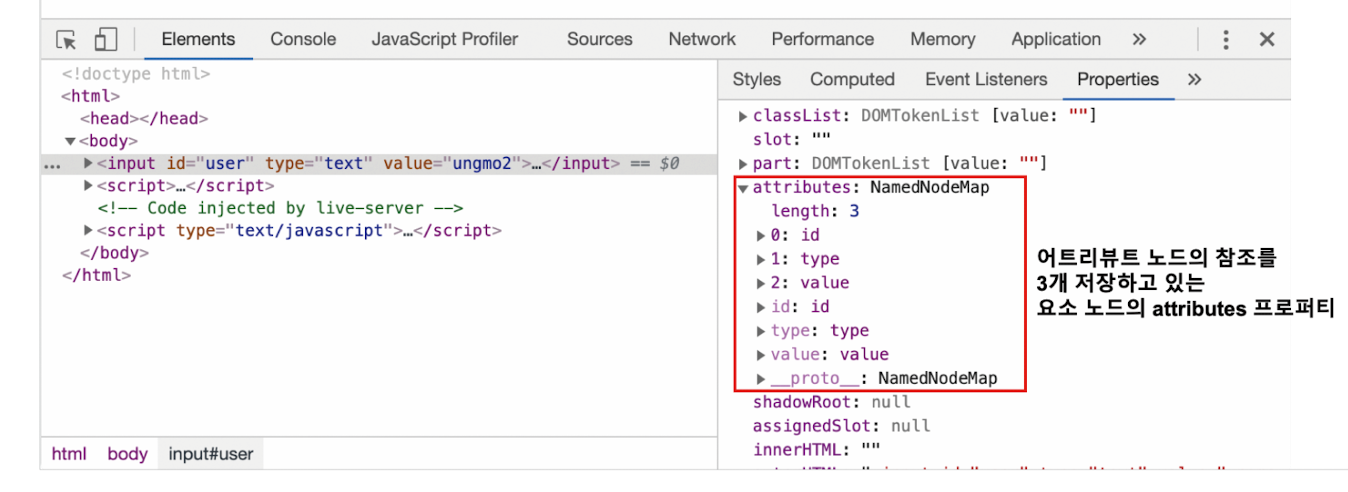<!DOCTYPE html> <html> <body> <input id="user" type="text" value="ungmo2"> <script> const $input = document.getElementById('user'); // attributes 프로퍼티에 저장된 value 어트리뷰트 값 console.log($input.getAttribute('value')); // ungmo2 // 요소 노드의 value 프로퍼티에 저장된 value 어트리뷰트 값 console.log($input.value); // ungmo2 </script> </body> </html>(1) 어트리뷰트 노드