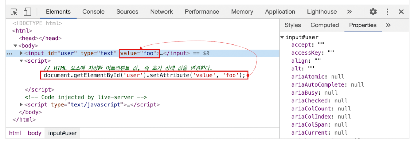 <!DOCTYPE html> <html> <body> <input id="user" type="text" value="ungmo2"> <script> const $input = document.getElementById('user'); // DOM 프로퍼티에 값을 할당하여 HTML 요소의 최신 상태를 변경한다. $input.value = 'foo'; console.log($input.value); // foo // getAttribute 메서드로 취득한 HTML 어트리뷰트 값, 즉 초기 상태 값은 변하지 않고 유지된다. console.log($input.getAttribute('value')); // ungmo2 </script> </body> </html>다만, 사용자 입력에 의한 상태 변화와 관계없는 id와 같은 어트리뷰트는 프로퍼티와 항상 동일한 값을 유지한다(반대도 마찬가지).