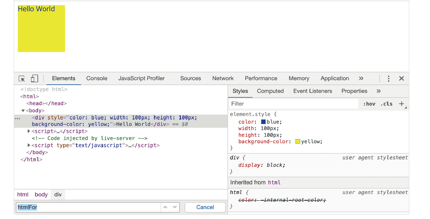 <!DOCTYPE html> <html> <body> <div style="color: red">Hello World</div> <script> const $div = document.querySelector('div'); // 인라인 스타일 취득 console.log($div.style); // CSSStyleDeclaration { 0: "color", ... } // 인라인 스타일 변경 $div.style.color = 'blue'; // 인라인 스타일 추가 $div.style.width = '100px'; $div.style.height = '100px'; $div.style.backgroundColor = 'yellow'; </script> </body> </html>