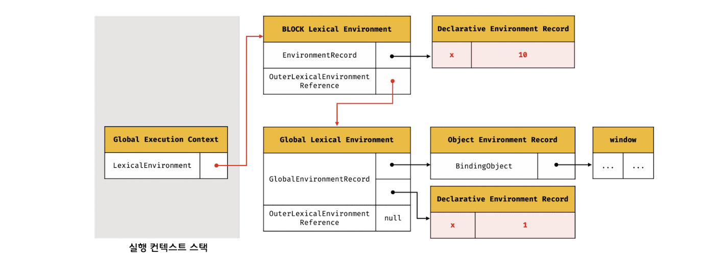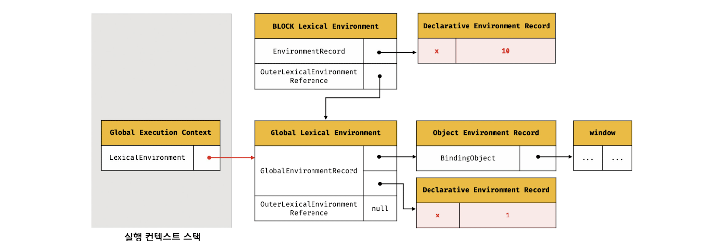 let x = 1; if (true) { let x = 10; console.log(x); // 10 } console.log(x); // 1위 예제에서 if문의 코드 블록 내에서 let 키워드로 변수다 선언되었다. 따라서 if문의 코드 블록이 실행되면 if문의 코드 블록을 위한 블록 레벨 스코프를 생성해야 한다. 즉, 선언적 환경 레코드를 갖는 렉시컬 환경을 새롭게 생성하여 기존의 전역 렉시컬 환경을 교체한다.