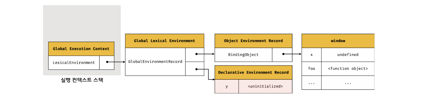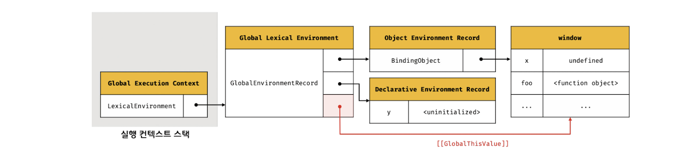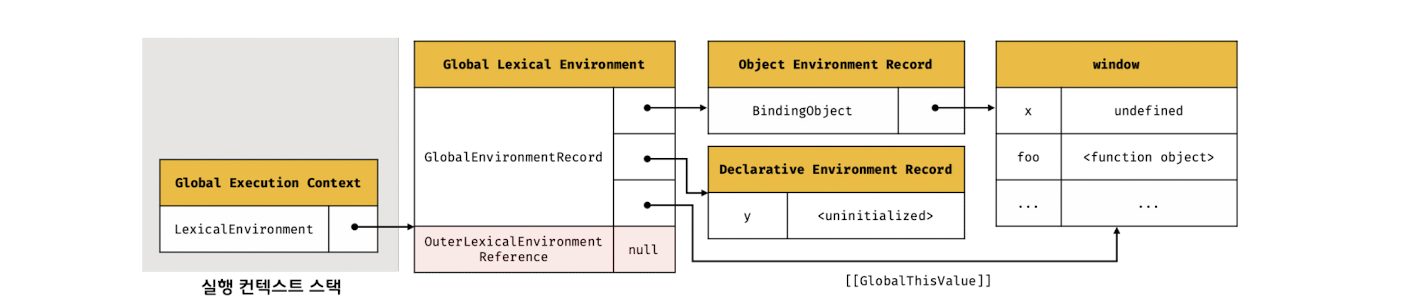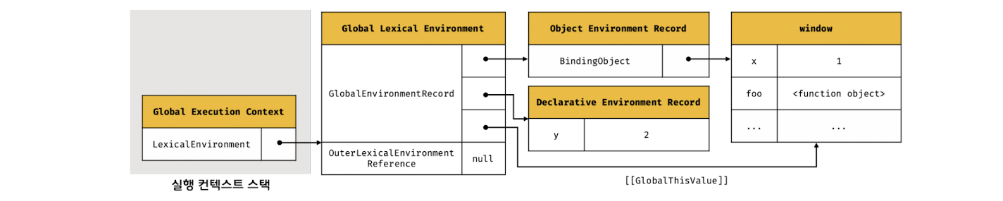 객체 환경 레코드는 BindingObject라고 부르는 객체와 연결된다. 이때 BindingObject는 전역 객체 생성에서 생성된 전역 객체이다. 그 후에 전역 코드 평가 과정에서 var 키워드로 선언한 전역 변수와 함수 선언문으로 정의된 전역 함수는 전역 환경 레코드 - 객체 환경 레코드 - BindingObject를 통해 전역 객체의 프로퍼티와 메서드가 된다. 이때 등록된 식별자를 객체 환경 레코드에서 검색하면 전역 객체의 프로퍼티에서 검색하여 반환한다