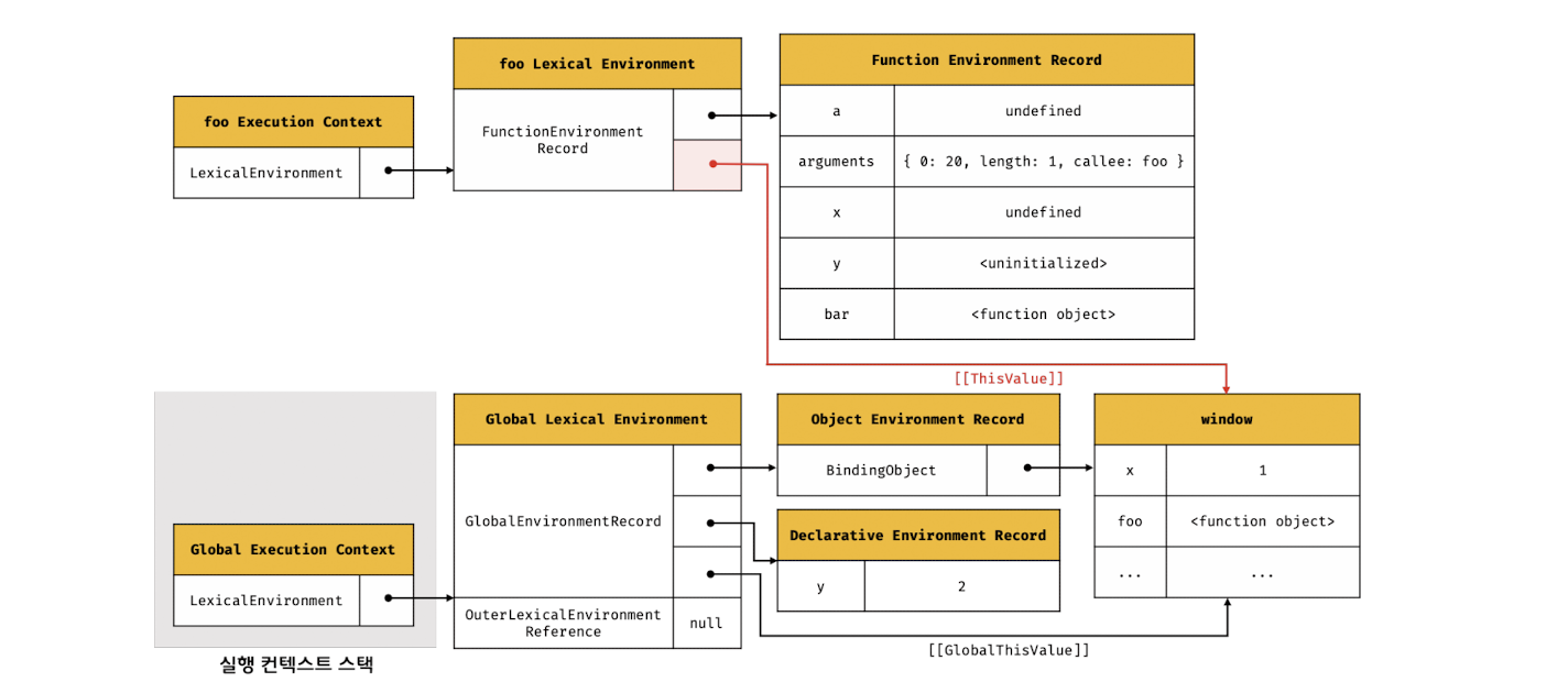 Foo 함수 렉시컬 환경을 생성하고 함수 실행 컨텍스트에 바인딩한다. 렉시컬 환경을 환경 레코드와 외부 렉시컬 환경에 대한 참조로 구성된다.