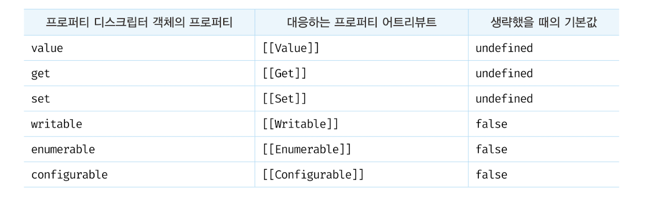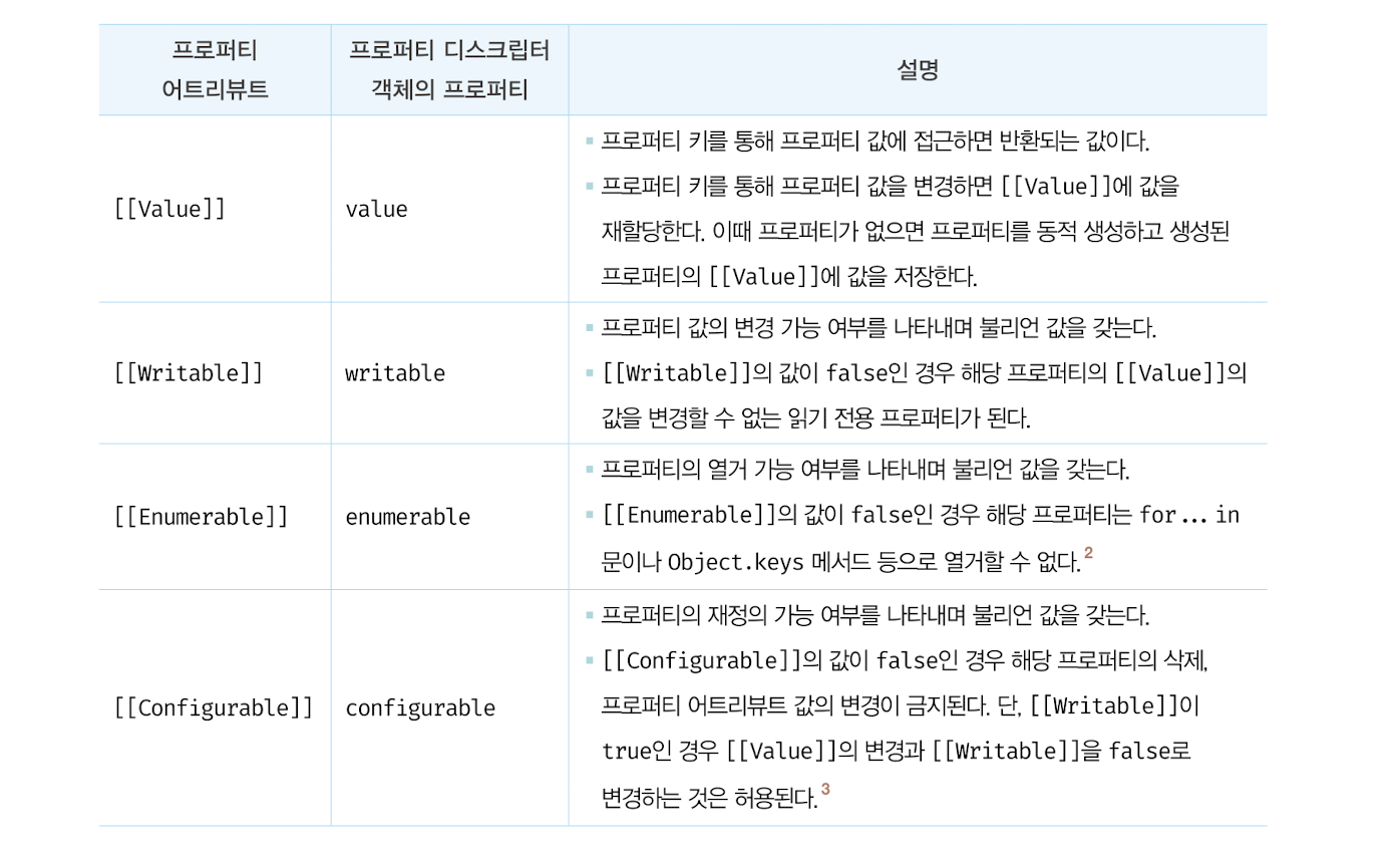 자바스크립트는 property를 생성할 때 property의 상태를 나타내는 attribute를 기본값으로 자동 정의한다. 이 attribute에는 property의 값[[Value]], 값의 갱신 여부[[Writable]], 열거 가능 여부[[Enumerable]], 재정의 가능 여부[[Configurable]]가 있다.