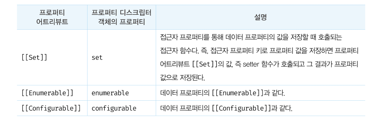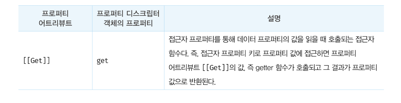 const person = { name: 'Lee' }; // 프로퍼티 어트리뷰트 정보를 제공하는 프로퍼티 디스크립터 객체를 취득한다. console.log(Object.getOwnPropertyDescriptor(person, 'name')); // {value: "Lee", writable: true, enumerable: true, configurable: true}2) 접근자 프로퍼티