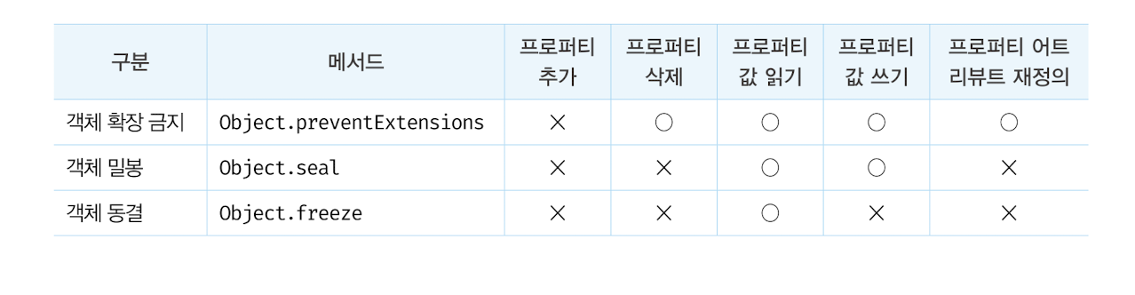 자바스크립트는 객체의 변경을 방지하는 다양한 메서드를 제공한다. 객체 변경 방지 메서드들을 객체의 변경을 금지하는 강도가 다르다.