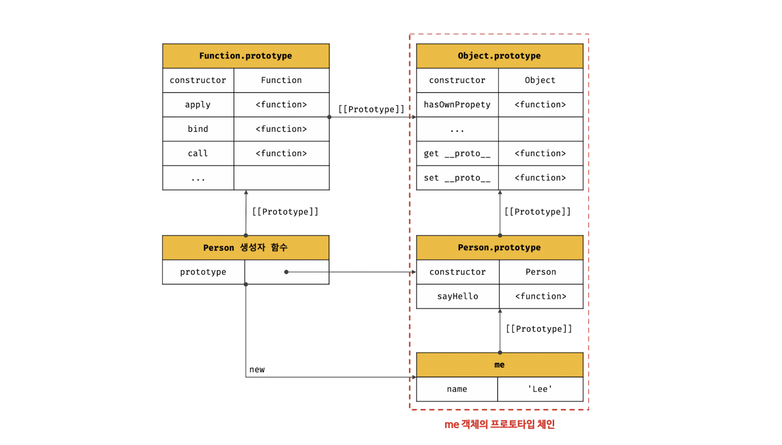 function Person(name) { this.name = name; } // 프로토타입 메서드 Person.prototype.sayHello = function () { console.log(`Hi! My name is ${this.name}`); }; const me = new Person('Lee'); // hasOwnProperty는 Object.prototype의 메서드다. console.log(me.hasOwnProperty('name')); // truePerson 생성자 함수에 의해 생성된 me 객체는 Object.prototype의 메서드인 hasOwnProperty를 호출할 수 있다. 이것은 me 객체가 Person.prototype뿐만 아니라 Object.prototype도 상속받았다는 것을 의미한다.