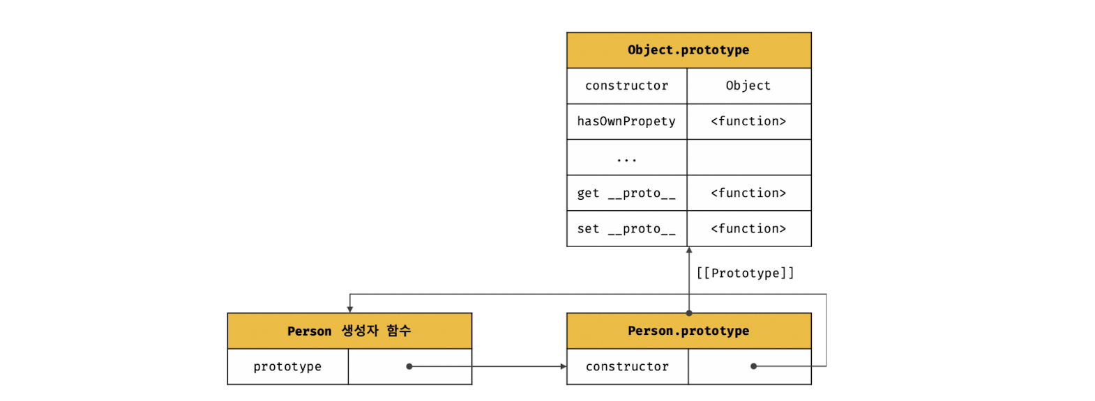 생성된 prototype은 Person의 prototype 프로퍼티에 바인딩 되고 prototype 프로퍼티는 객체이고, 모든 객체는[[prototype]]을 가지므로 prototype 자체도[[prototype]]을 가진다. 이 [[prototype]]은 Object.prototype이다. 따라사 사용자 정의 생성자 함수는 자신이 평가되어 함수 객체로 생성되는 시점에서 prototype 프로퍼티를 가지게 되고 이 프로퍼티의 [[prototype]]은 언제나 Object.prototype이므로 Object의 메서드를 사용할 수 있게 되는 것이다.