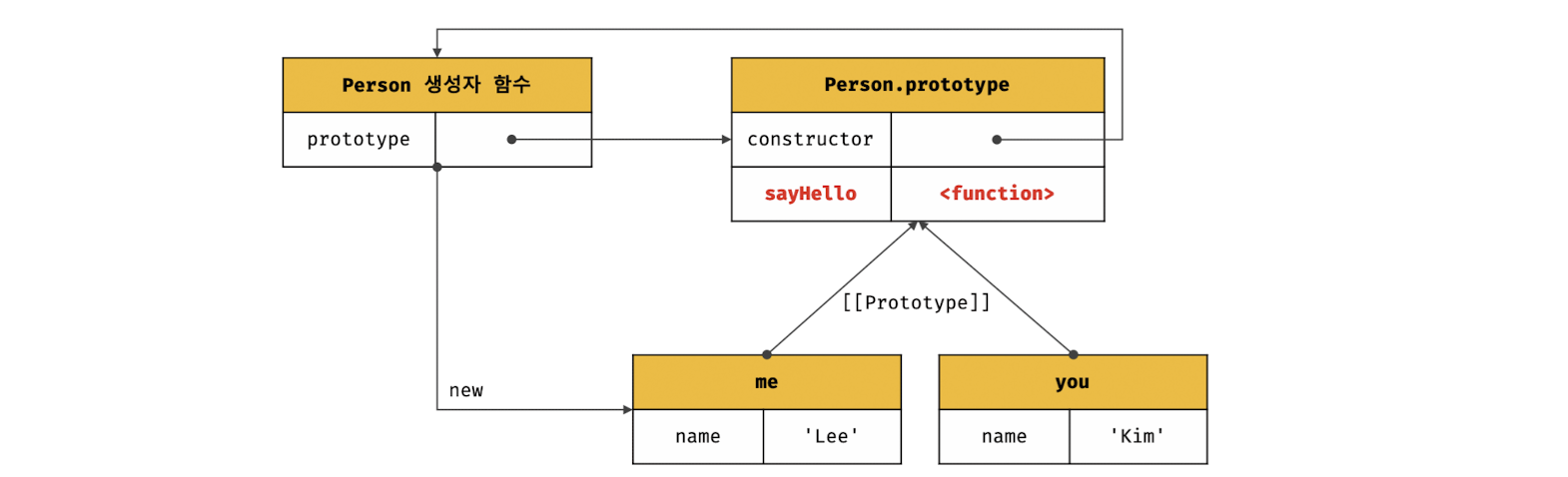 function Person(name) { this.name = name; } // 프로토타입 메서드 Person.prototype.sayHello = function () { console.log(`Hi! My name is ${this.name}`); }; const me = new Person('Lee'); const you = new Person('Kim'); me.sayHello(); // Hi! My name is Lee you.sayHello(); // Hi! My name is Kim