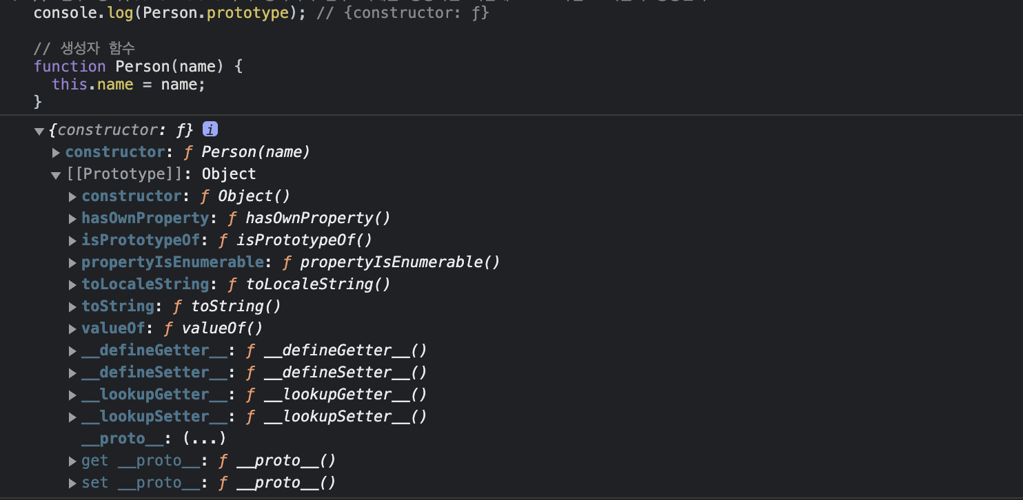 // 함수 Person이 평가될 때 자동으로 ptototype도 함께 생성됨 console.log(Person.prototype); // {constructor: ƒ} // 생성자 함수 function Person(name) { this.name = name; }Person.prototype을 자세히 보자