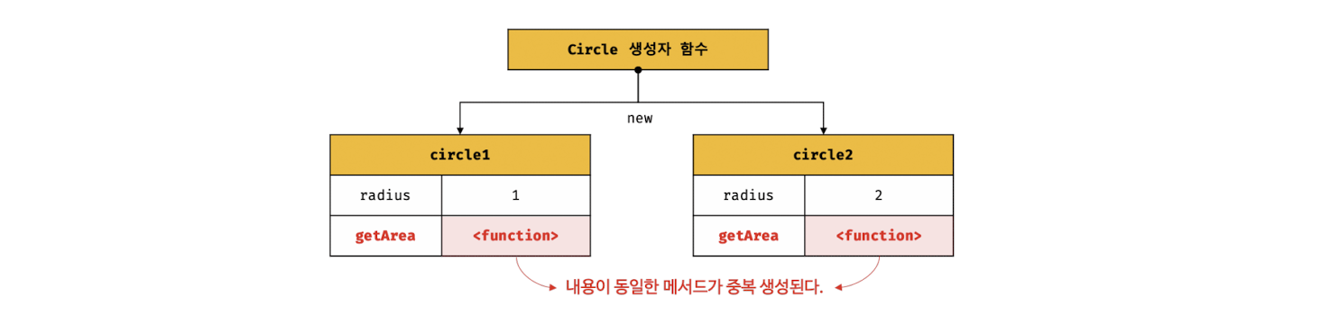 // Circle 생성자 함수는 인스턴스를 생성할 때마다 동일한 동작을 하는 getArea 메서드를 중복 생성하고 모든 인스턴스가 중복 소유한다.
