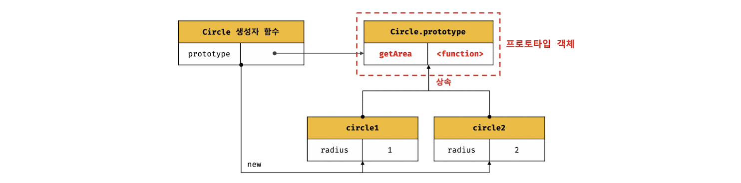 // 생성자 함수 function Circle(radius) { this.radius = radius; } // Circle 생성자 함수가 생성한 모든 인스턴스가 getArea 메서드를 공유해서 사용할 수 있도록 프로토타입에 추가한다. // 프로토타입은 Circle 생성자 함수의 prototype 프로퍼티에 바인딩되어 있다. Circle.prototype.getArea = function () { return Math.PI * this.radius ** 2; }; // 인스턴스 생성 const circle1 = new Circle(1); const circle2 = new Circle(2); // 프로토타입 Circle.prototype으로부터 getArea 메서드를 상속받는다. // Circle 생성자 함수가 생성하는 모든 인스턴스는 하나의 getArea 메서드를 공유한다. console.log(circle1.getArea === circle2.getArea); // true console.log(circle1.getArea()); // 3.141592653589793 console.log(circle2.getArea()); // 12.566370614359172생성자 함수가 생성한 모든 인스턴스는 자신의 프로토타입([[prototype]],__proto__), 즉 상위 객체 역할을 하는 생성자 함수의 prototype 객체의 모든 프로퍼티와 메소드를 상속받는다. 따라서 위 예제에서 getArea 메서드는 단 하나만 생성되어 생성자함수의 프로토타입의 메서드로 할당되어 있고, 인스턴스들은 생성자 함수의 prototype을 상속받아 해당 prototype의 메서드인 getArea를 사용할 수 있게 된다.