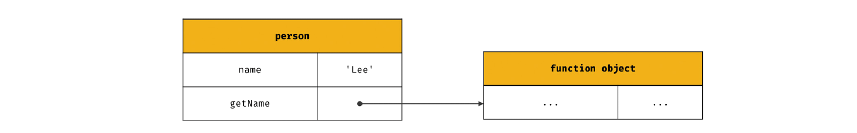 const person = { name: 'Lee', getName() { // 메서드 내부의 this는 메서드를 호출한 객체에 바인딩된다. return this.name; } }; // 메서드 getName을 호출한 객체는 person이다. console.log(person.getName()); // Lee객체의 메서드로 정의되어 있다는 것은 메서드는 프로퍼티에 바인딩된 함수라는 것이다. 즉, 그 메서드 함수 자체는 그 객체에 포함된 것이 아니라 객체의 프로퍼티가 그 함수를 가리키고 있을 뿐인 것이다.