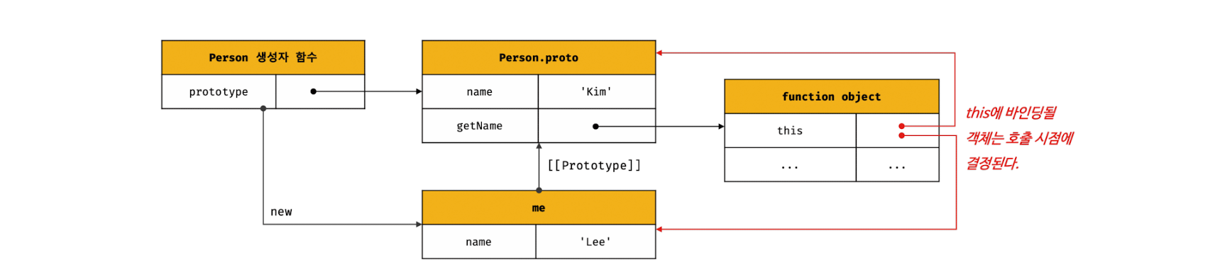 function Person(name) { this.name = name; } Person.prototype.getName = function () { return this.name; }; const me = new Person('Lee'); // getName 메서드를 호출한 객체는 me다. console.log(me.getName()); // ① Lee Person.prototype.name = 'Kim'; // getName 메서드를 호출한 객체는 Person.prototype이다. console.log(Person.prototype.getName()); // ② Kim